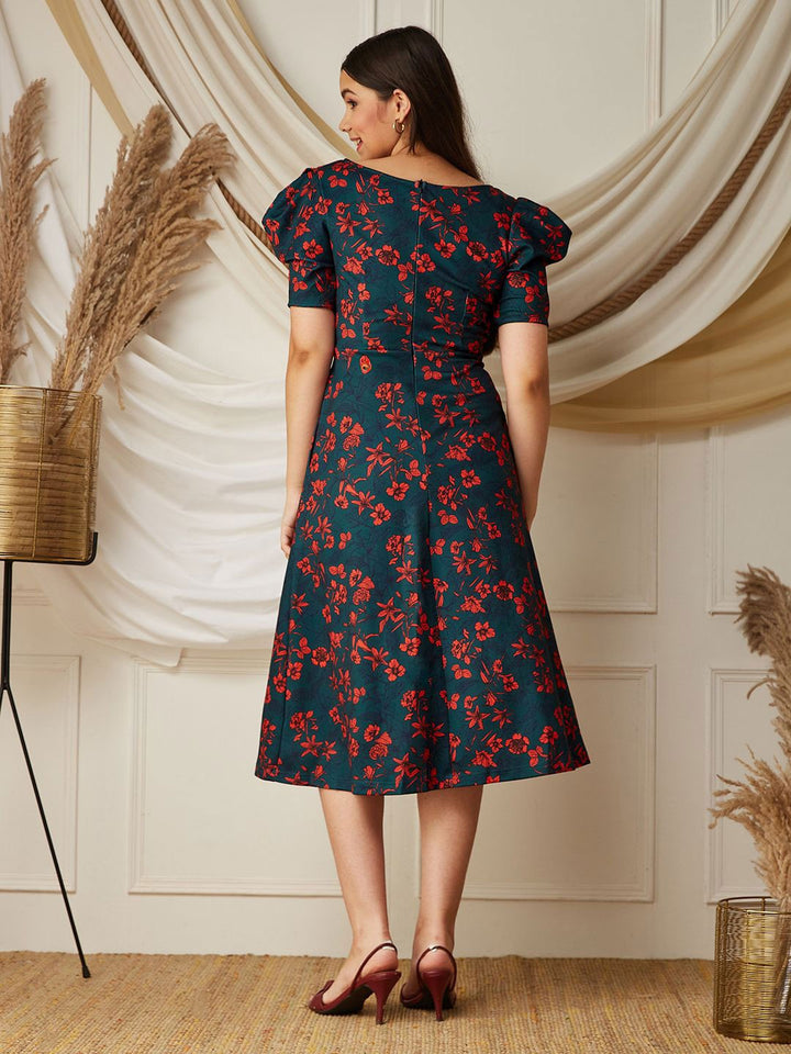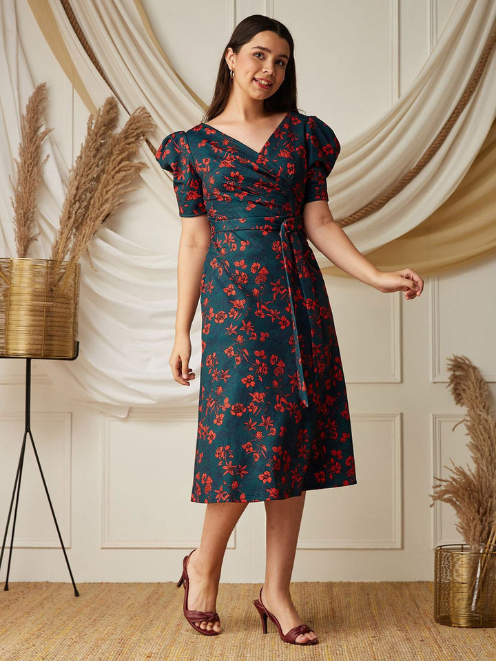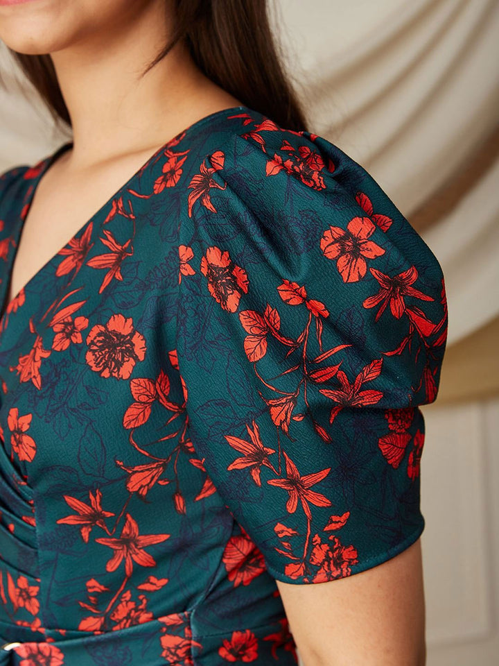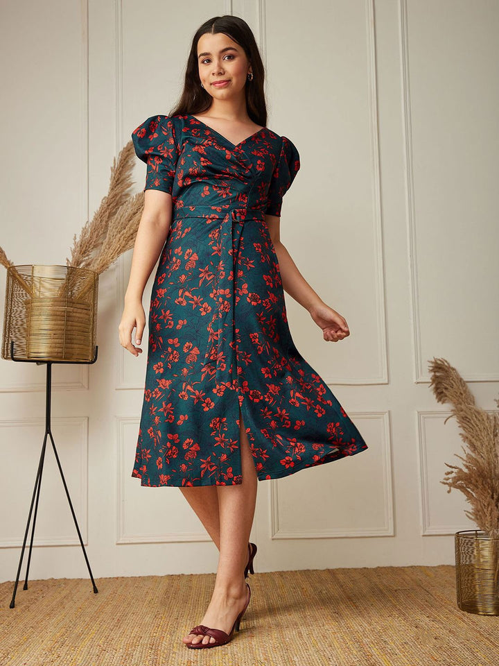 Girls Floral Printed Puff Sleeves Wrap Midi Dress
