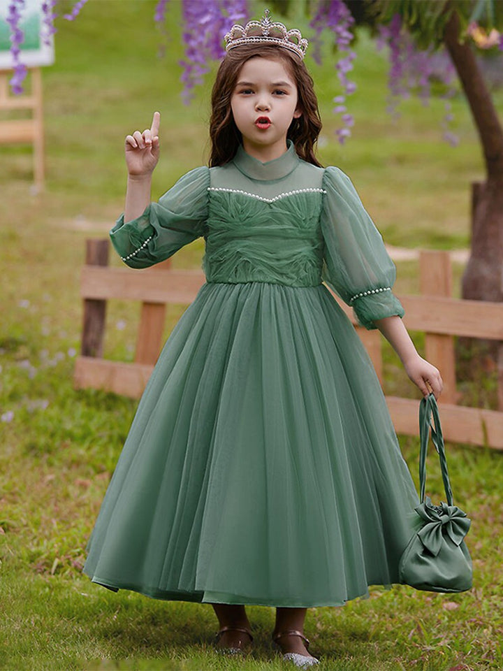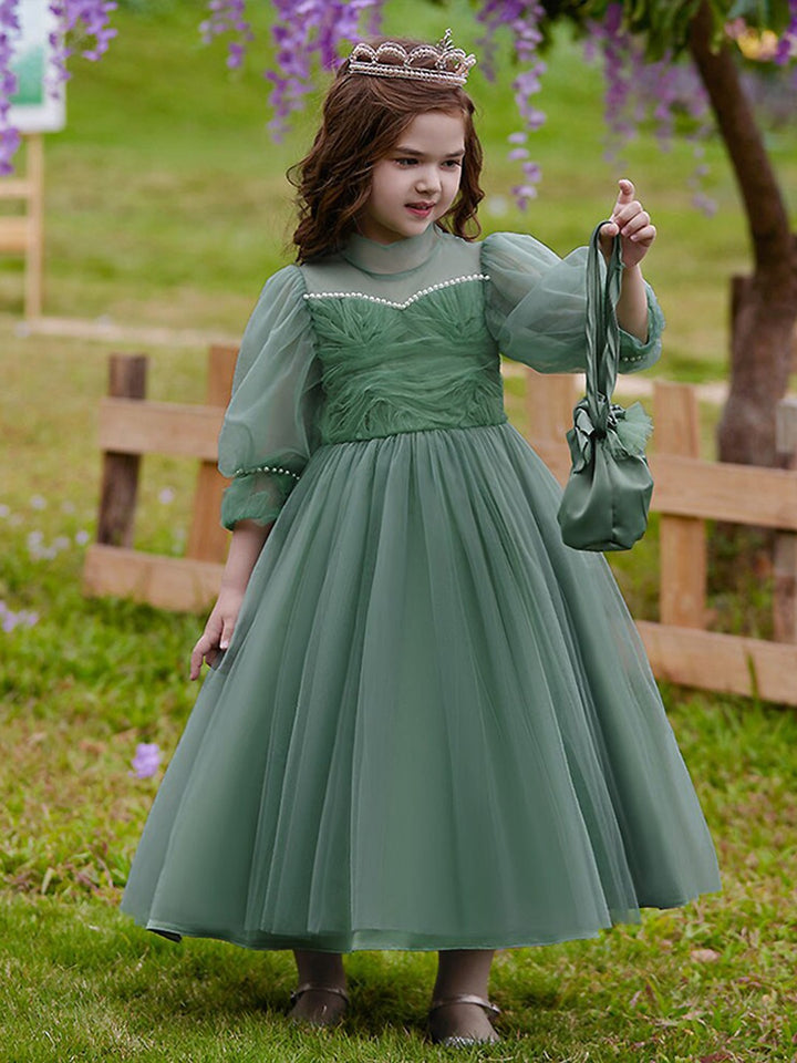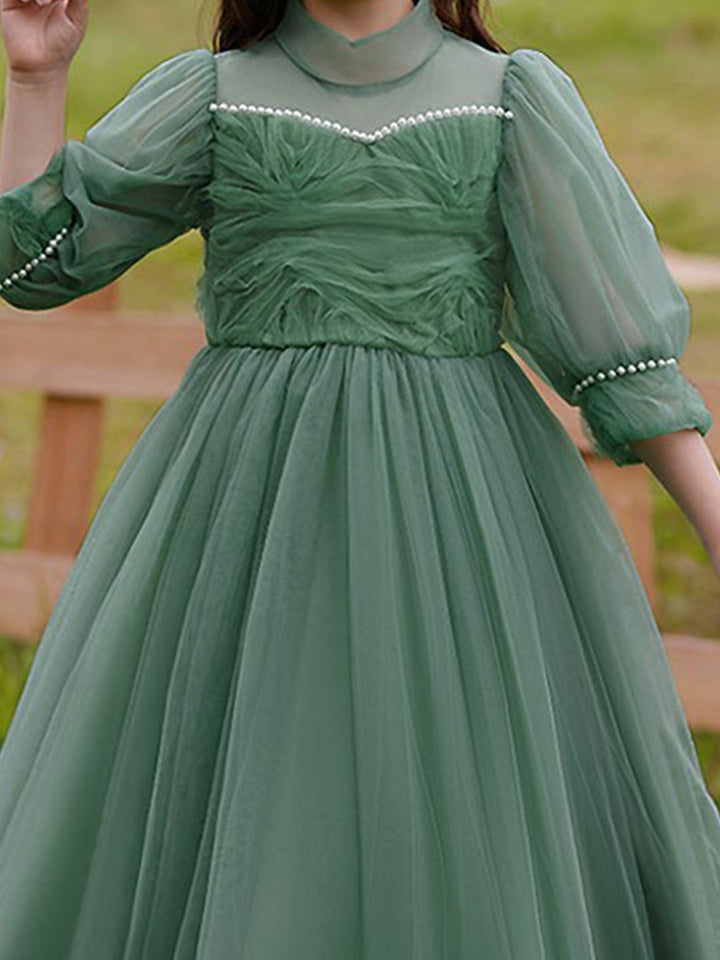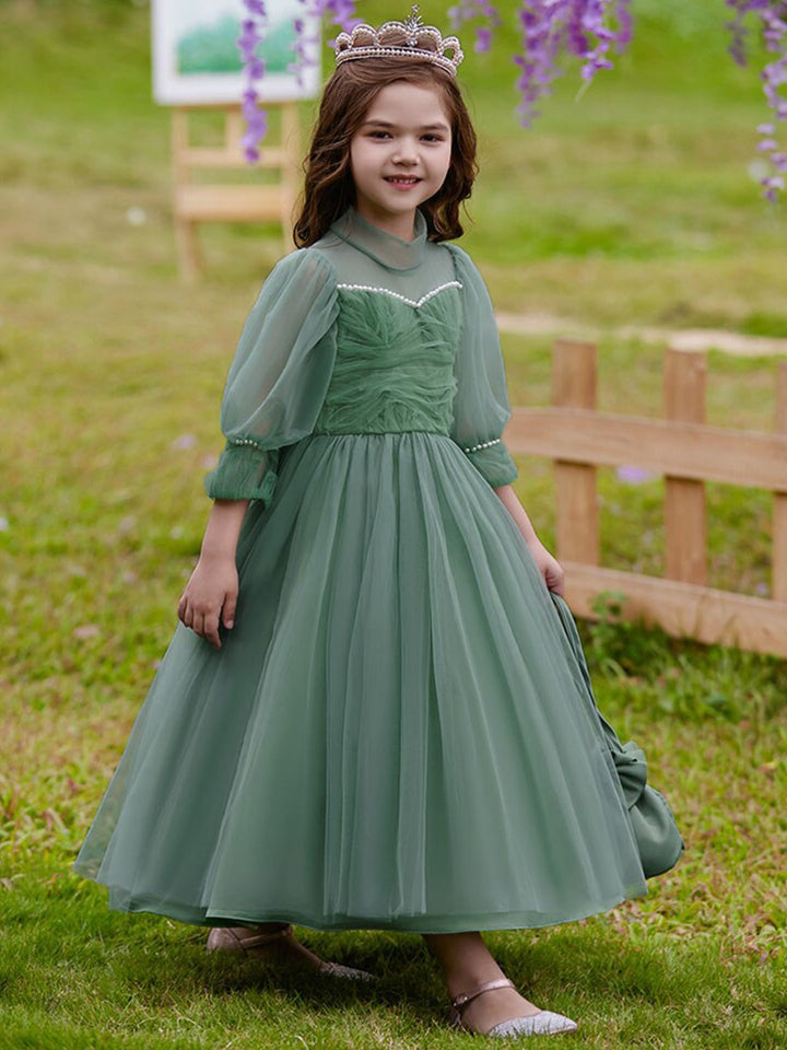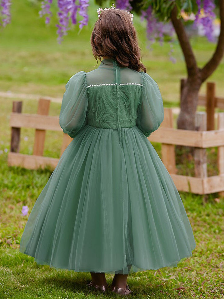 Green Girls Self Design Embellished High Neck Puff Sleeves Gown Maxi Dress
